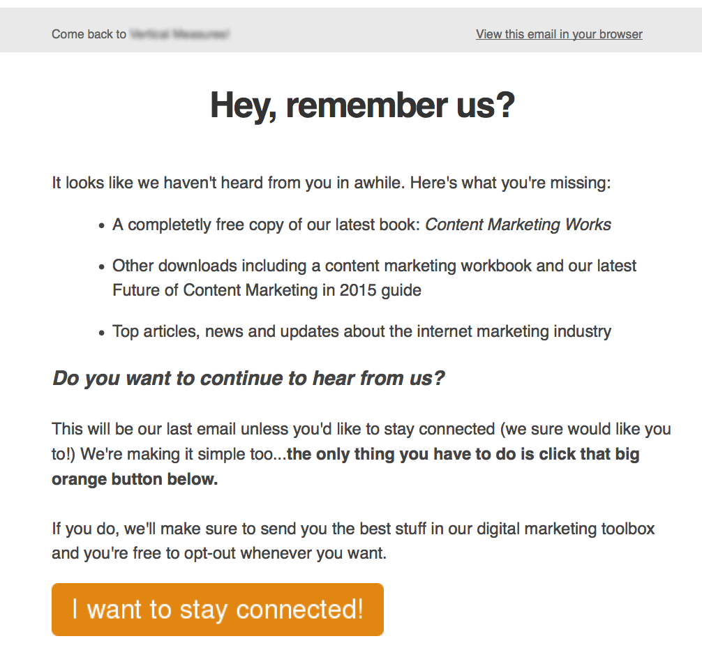Here’s what Somanchi recommends: If you’ve been sending emails once a day, start sending them once a week. If you’ve been sending once a week, switch to once a month. If you haven’t seen any response from a subscriber in three to six months, send them an email asking if they still want to hear from you. If there is no response (or a “no” response), let them go.